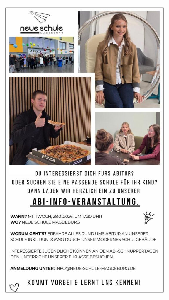 Allgemein Kommt zur Abi-Info-Veranstaltung am 28.01.2026 um 17:30 Uhr 24. Januar 202624. Januar 2026 von Birgit Heine Neue Schule mit neuem Lernkonzept [Radio SAW 19.12.25] Birgit Heine Ähnliche ArtikelNeue Schule mit neuem Lernkonzept…Offizielle Einweihung von Magdeburgs modernster…Weihnachtsmarkt & Weihnachtswunder am 18.12.2025…Weihnachts-Projektwoche [15.-17.12.25]Podiumsdiskussion für mehr Schulwegsicherheit und…Handwerker-Tag live: „Von der Idee…Bilder der Künstlerin Mana am…Halloween-Übernachtungsparty im Hort [23.10.25]Gewinner der Verlosung beim Cleaning…Impressionen vom Tag der offenen…